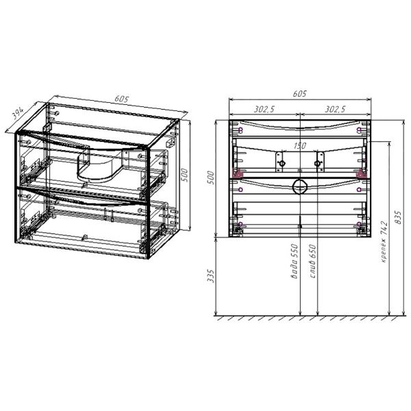 Система хранения: два выдвижных ящика soft close (механизм доводчика).