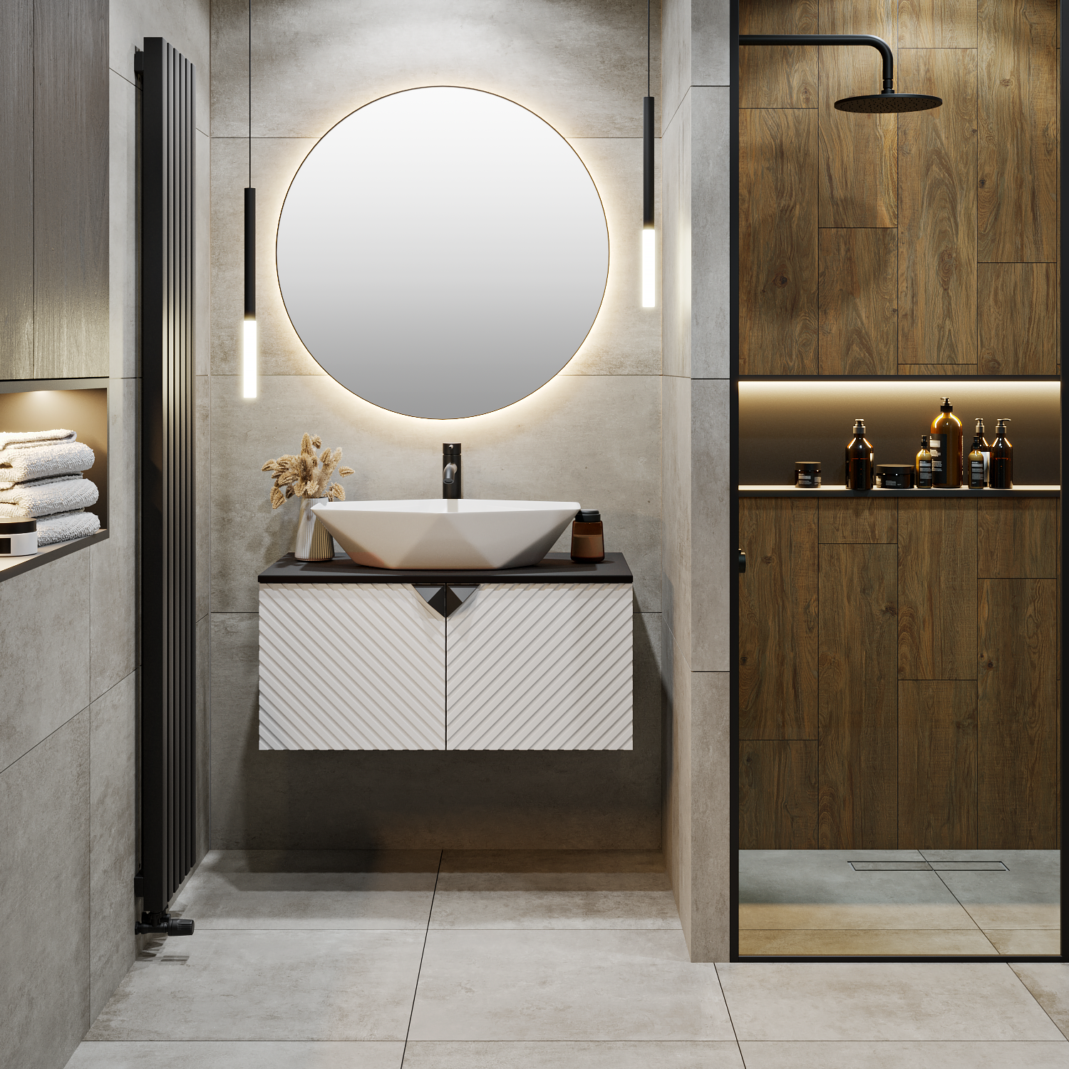 Тумба под раковину в ванную RUNO Андорра (подвесная) – это изысканность и утончённая роскошь в интерьере. Рифленые фасады визуально «оживляют» и «приводят в движение» всю обстановку комнаты, сохраняя при этом умиротворение и покой. Цвета корпуса и фасада имеют идеальное классическое цветовое сочетание белого и чёрного цветов, которые идеально впишутся в любой интерьер ванной комнаты. Тумба оснащена двумя распашными дверцами, дверцы укомплектованы петлями верхняя с доводчиком, нижняя без доводчика. К тумбе для ванной подойдут умывальники на столешницу: «OVALE 50» (50х36см) - идеальное решение для стильного интерьера ванной, создан для минималистичных интерьеров и подойдёт для санузлов в стиле лофт, минимализм и хай-тек. Строгая овальная геометрически правильная форма раковины, усиливает идею лаконичности в дизайне, устанавливается на столешницу, накладным методом. «PALLA D41» (диаметр 41см) - идеальное решение для стильного интерьера ванной, создан для минималистичных интерьеров и подойдёт для санузлов в стиле лофт, минимализм и хай-тек. Строгая круглая геометрически правильная форма раковины, усиливает идею лаконичности в дизайне, устанавливается на столешницу, накладным методом. «TRE 48» (48х37см) - идеальное решение для стильного интерьера ванной, создан для минималистичных интерьеров и подойдёт для санузлов в стиле лофт, минимализм и Хай-Тек. Строгая прямоугольная форма с округлыми углами усиливает идею лаконичности в дизайне, устанавливается на столешницу, накладным методом. «TERZO 60» (59х39см) - идеальное решение для стильного интерьера ванной, создан для минималистичных интерьеров и подойдёт для санузлов в стиле лофт, минимализм и хай-тек. Асимметричная раковина, которую можно установить любой стороной, дизайнерское решение для нестандартных интерьеров, усиливает идею лаконичности в дизайне, устанавливается на столешницу, накладным методом. И другие накладные раковины бренда RUNO.