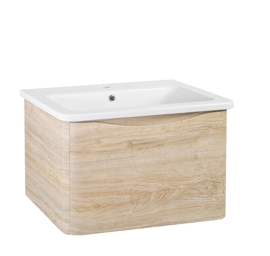 Тумба с раковиной в ванную Runo Тоскана (подвесная) - выполнена в ультрасовременном дизайне в цвете светлое дерево. Тумба под раковину отличается изысканным дизайном, скруглённые углы тумбы, древесная текстура фасада, врезная ручка – придают мебели необычный и незабываемый внешний вид. Тумба в ванную оснащена выдвижным ящиком на шариковых направляющих, с системой плавного закрывания. Тумба под раковину ТОСКАНА гармонично впишется в любой интерьер ванной комнаты. Тумба для ванной комплектуется накладным керамическим умывальником Никсон 80 (800х460 мм) ТМ Dreja, необычный дизайн которого сочетание строгих линий прямоугольника со скруглёнными углами, отражают современные тренды в дизайне. Раковина глубиной 16 см. Мебель для ванной комнаты RUNO - красота и практичность в мелочах!