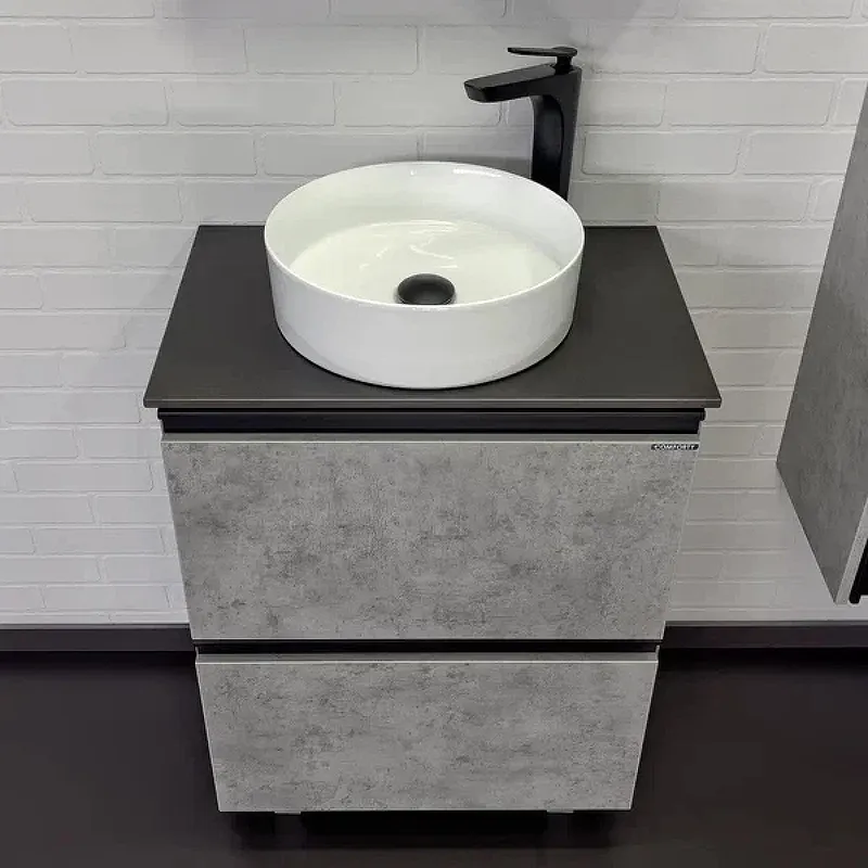 Тумба с раковиной Comforty Эдинбург 00-00004767 60 см Бетон светлыйХарактеристики: Тумба: Цвет: бетон светлый. Габариты вместе с раковиной (ШхВхГ): 60x95x40 см. Материал фасада и корпуса: ВЛДСП. Система хранения: выдвижные ящики. Оснащение: механизм доводчика, обеспечивающий плавное закрывание. Монтаж: полуподвесной. Тумба подготовлена для подключения водоснабжения снизу. Раковина-чаша: Материал: санфарфор. Цвет: белый. В комплекте поставки: тумба, раковина-чаша Comforty 9111, 2 ножки, 2 черные матовые профильные ручки, столешница из черного керамогранита, крепления