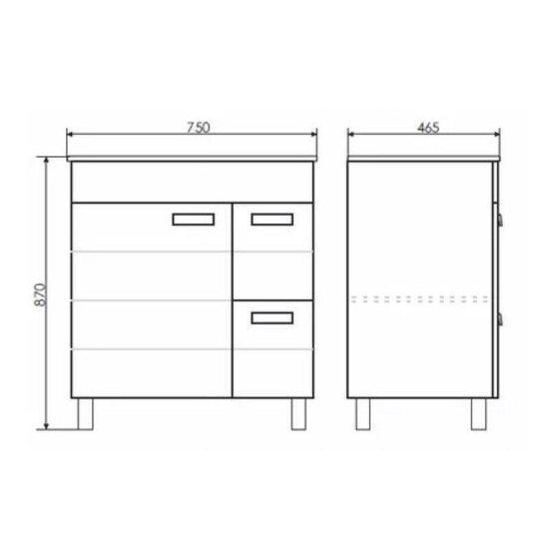 Габариты тумбы с раковиной (ШхВхД): 750х870х465 мм.