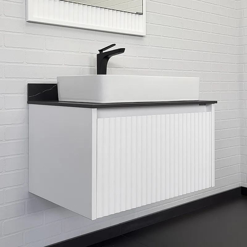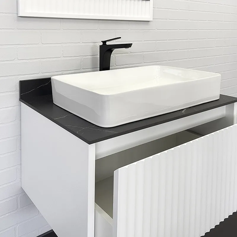 Тумба с раковиной Comforty Марсель 00-00013396 75 см Белая матоваяХарактеристики: Тумба: Цвет: белый матовый. Цвет столешницы: под мрамор Калакатта Блэк. Материал тумбы: влагостойкий ЛДСП, МДФ. Фасад тумбы фрезерован геометрическим узором с имитацией волны. Материал столешницы: керамогранит. Организация хранения: ящик с системой плавного закрывания. Тумба подготовлена для подключения водоснабжения снизу. Монтаж: подвесной. Раковина-чаша: Цвет: белый. Материал: санфарфор. Форма: прямоугольная. В комплекте поставки: тумба, столешница, раковина-чаша Comforty 78189, крепежный комплект