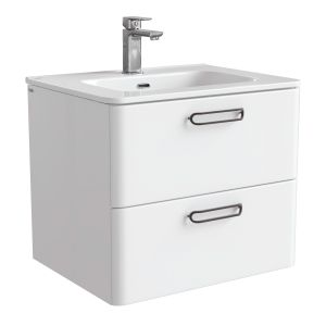 Тумба с умывальником для ванной комнаты, подвесная. Размеры тумбы без умывальника: 467х602х500 мм (ДхШхВ). Размеры умывальника: 460х600 мм (ДхШ). Фасад МДФ 19 мм в эмали (белый глянец). Корпус влагостойкий ВЛДСП 16 мм в эмали. Ручки - цвет состаренное олово. Два выдвижных ящика с механизмом плавного доведения. Пластиковый ограничитель под сифон в верхнем ящике. Перекатной организатор в нижнем ящике. Навесы усиленные с планкой. Упаковка: картон, пленка, пенопластовые уголки.