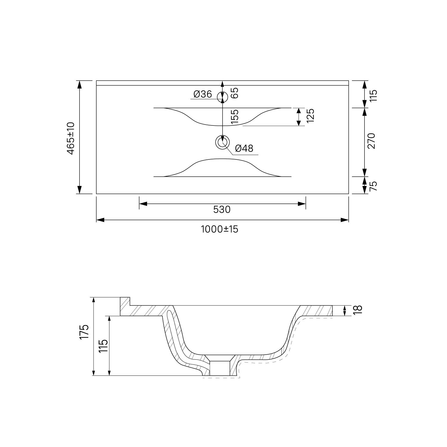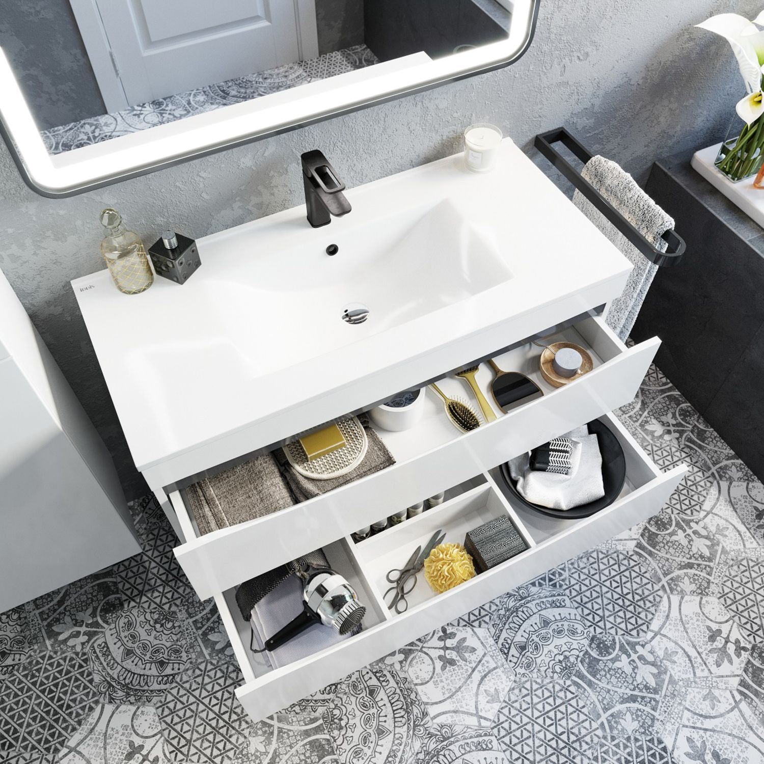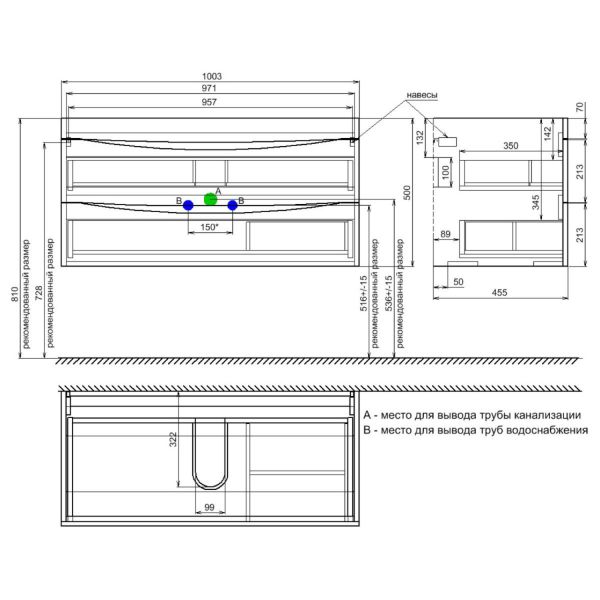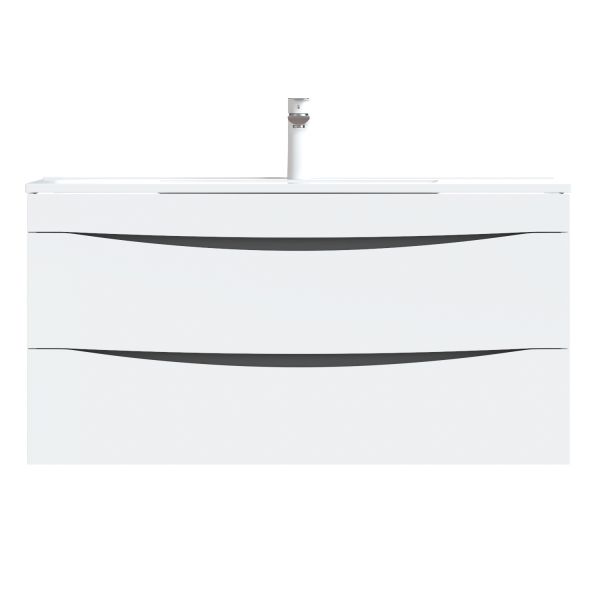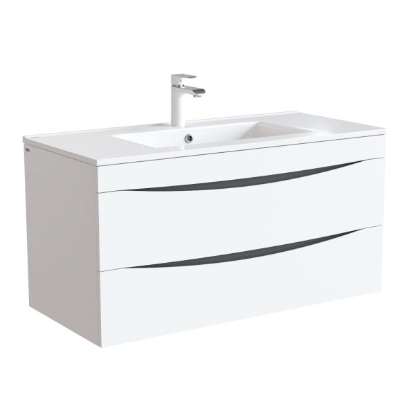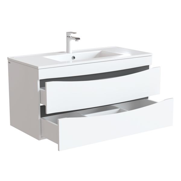 Тумба с умывальником для ванной комнаты, подвесная. Размеры тумбы без умывальника: 455х1003х500 мм (ДхШхВ). Размеры умывальника: 465х1000х175 мм (ДхШхВ). Фасад МДФ 19 мм в эмали (белая), фрезеровка. Корпус влагостойкий ЛДСП 16 мм в эмали. Интегрированные ручки. Два выдвижных ящика с механизмом плавного доведения. Пластиковый ограничитель под сифон в верхнем ящике. Перекатной организатор в нижнем ящике. Навесы усиленные с планкой. Упаковка: картон, пленка, пенопластовые уголки.
