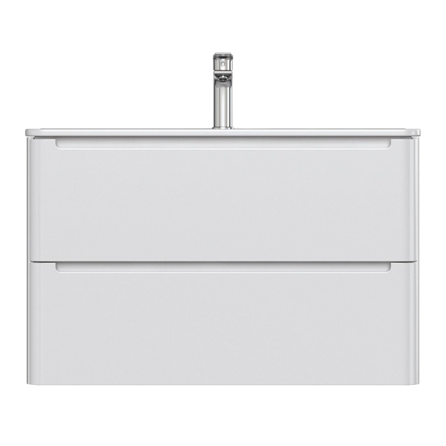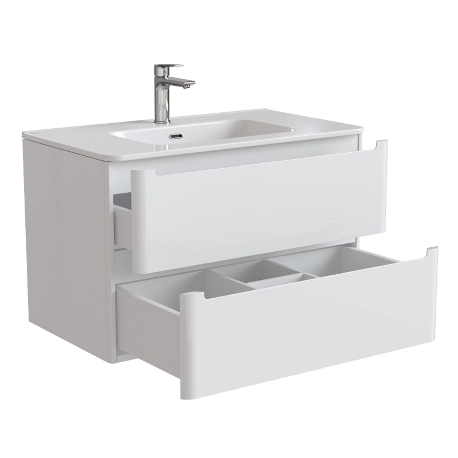 Тумба с умывальником для ванной комнаты, подвесная. Размеры: 467х802х500 мм (ДхШхВ). Фасад МДФ 19 мм в эмали , фрезеровка. Корпус ЛМДФ 16 мм в эмали. Интегрированные ручки. Два выдвижных ящика с механизмом плавного доведения. Пластиковый ограничитель под сифон в верхнем ящике. Перекатной органайзер в нижнем ящике. Навесы усиленные с планкой. Упаковка: картон, пленка, пенопластовые уголки.