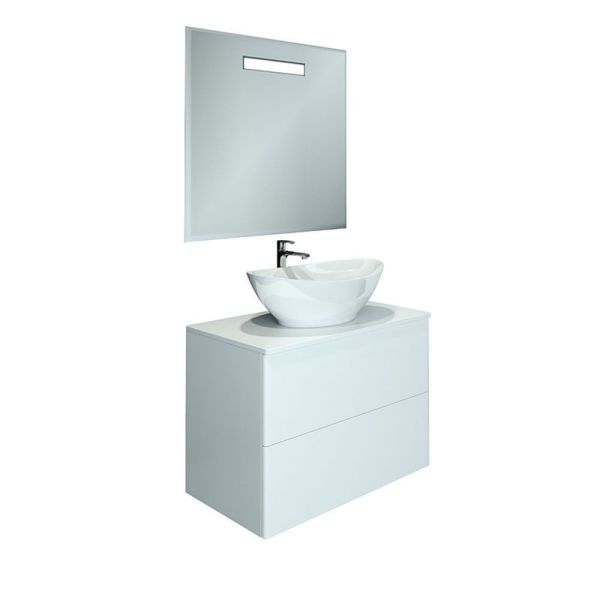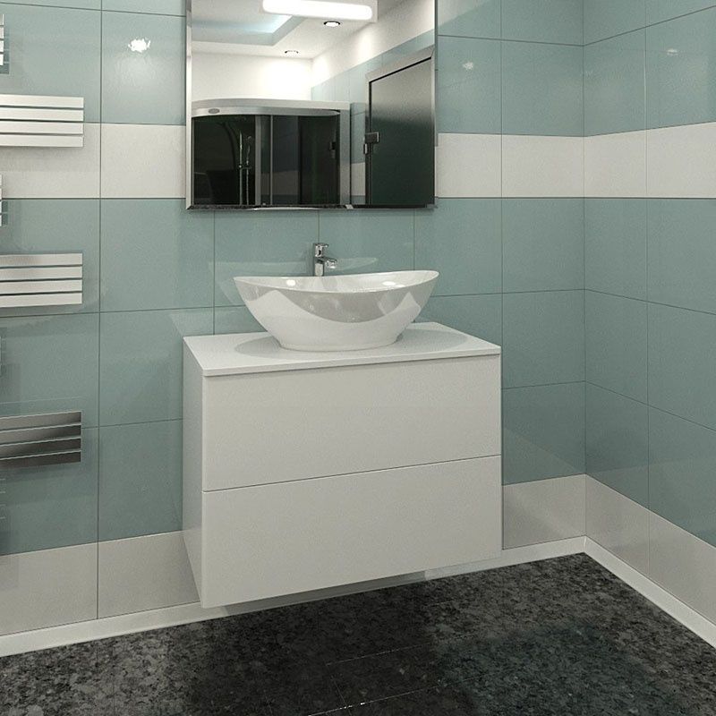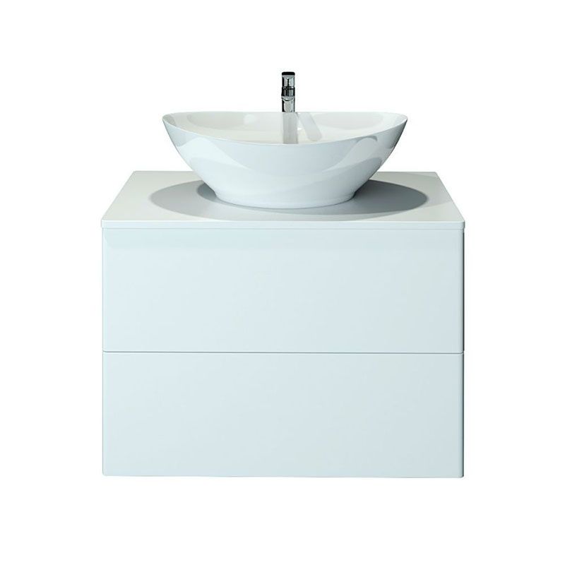 Подвесная тумба с раковиной-чашей и столешницей МДФ, с двумя выдвижными ящиками. Предназначена для использования в ванных комнатах с повышенной влажностью. Система Push to Open: ящики открываются нажатием на них. Высокое качество сборки, материалов и фурнитуры. Столешница, корпус и фасад: МДФ, плёнка ПВХ белая глянцевая. Раковина накладная (глубина 10 см) - фаянс.