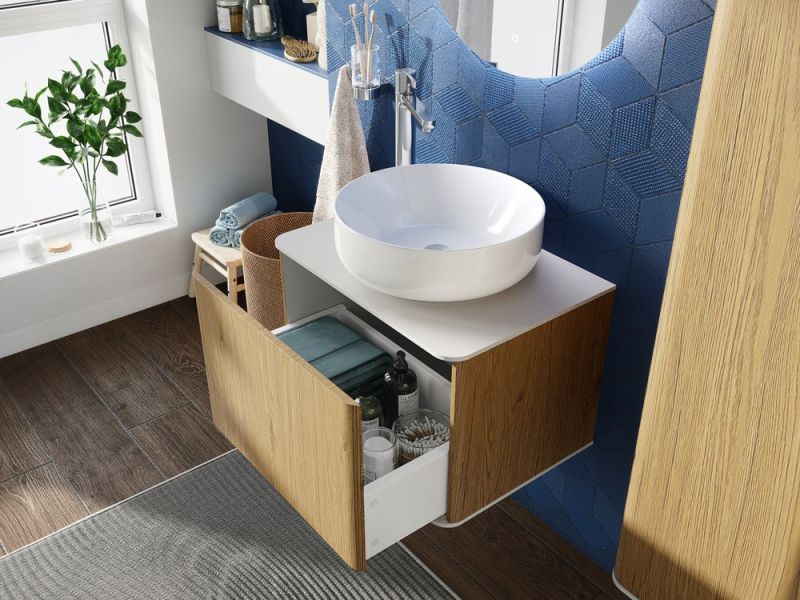 Тумба Stworki «Ноттвиль» (60 см) в оттенке светлого дерева поможет создать в ванной комнате легкую, воздушную атмосферу. Модель изготовлена из экологически чистой МДФ, защищенной от влаги, царапин и истирания пленкой Imawell. Лаконичный дизайн без острых углов и лицевой фурнитуры делает ее прекрасным выбором для обустройства небольшого санузла. Вместительный ящик оснащен нажимным механизмом открывания pushto ореn. Благодаря надежным направляющим с доводчиком даже при максимальной нагрузке он перемещается плавно и бесшумно. Рукомойник Stworki Moon 1 хорошо сочетается с плавными очертаниями тумбы. Выполненный из качественного фарфора, он отличается прочностью, долговечностью и простотой в уходе.Тумба для комплекта
