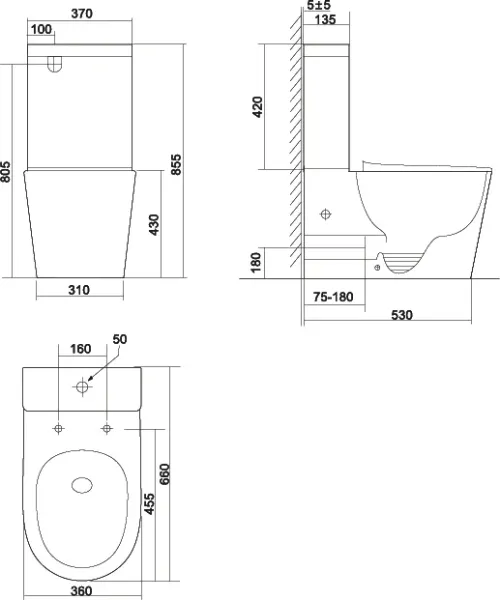 • Прилегание унитаза к стене: