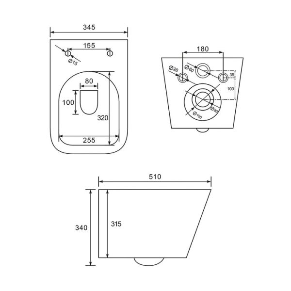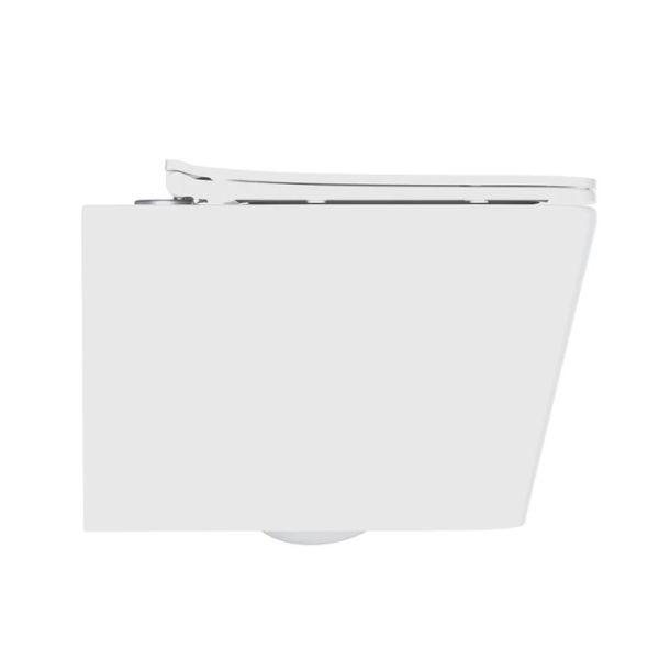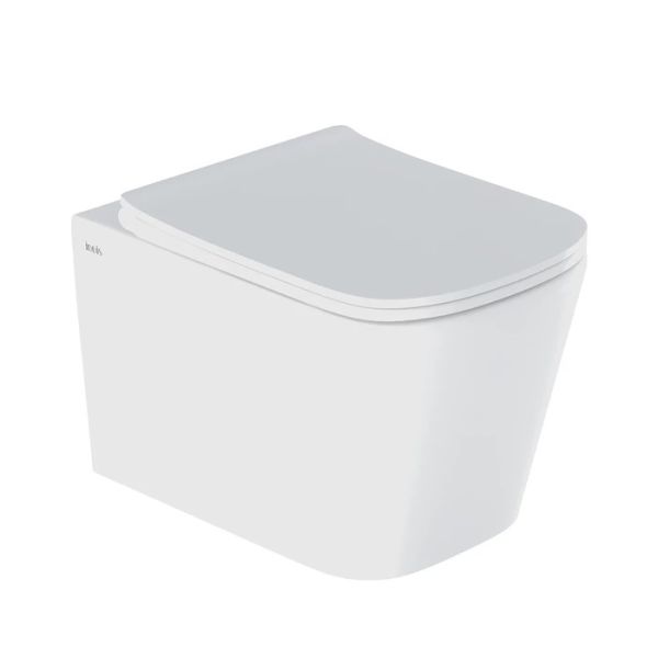 Унитаз подвесной безободковый с тонким сиденьем из дюропласта с EasyFix и SoftClose. Прямоугольная форма чаши. Комплект крепежа. Размер: 485х342х355 мм (ДхШхВ). Упаковка: картонная коробка.