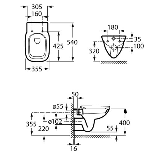 • Прилегание унитаза к стене: