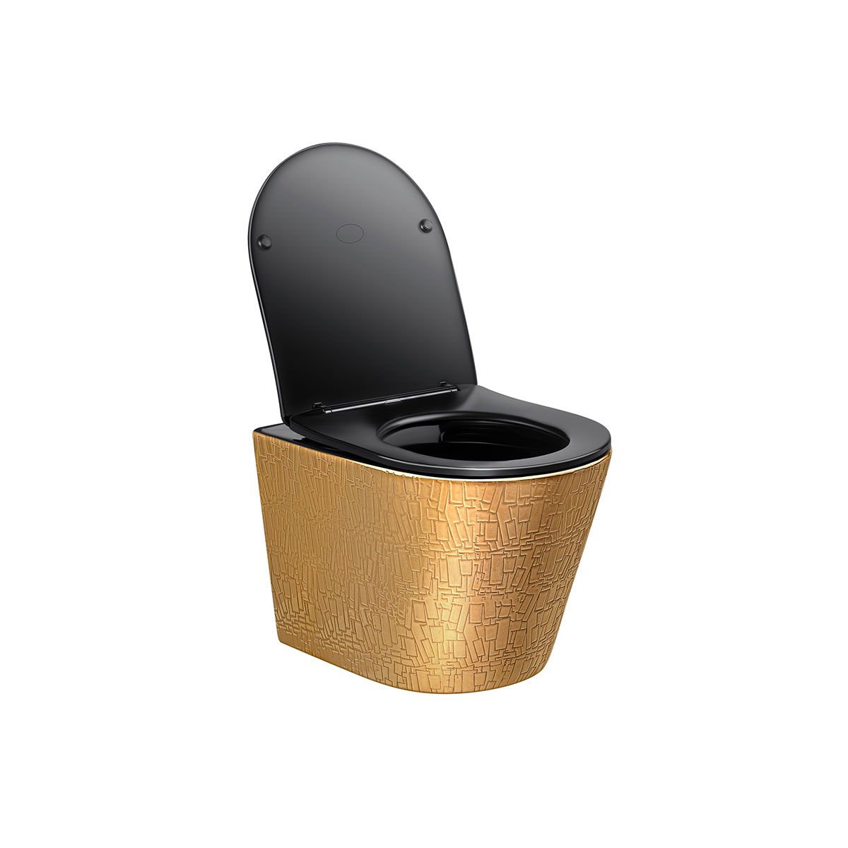 520х360х370Подвесной унитаз Vincea Piatti в черно-золотом исполнении – это эргономичное и элегантное решение для современной ванной комнаты. Унитаз изготовлен из высокопрочного фарфора. Внешняя часть чаши – покрытие золото с текстурой, внутренняя – глянцевый черный цвет, черная крышка. Унитаз укомплектован элегантным ультратонким быстросъемным сиденьем из дюроплласта с плавным опусканием черного цвета.