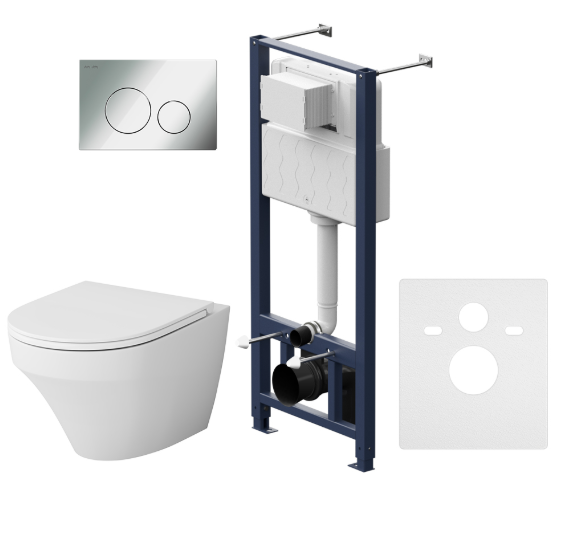 Полностью готовый к установке комплект: система инсталляции с клавишей, подвесной унитаз сиденьем.Неразборная рама из стального профиля выдерживает нагрузку до