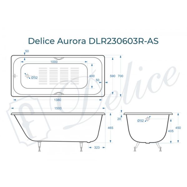 Ванна чугунная Delice Aurora DLR230603R-AS 150x70 с отверстиями под ручки и антискользящим покрытием