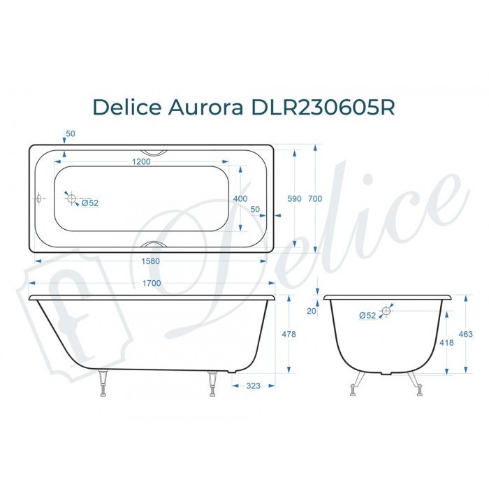 Ванна чугунная Delice Aurora DLR230605R 170x70 с отверстиями под ручки