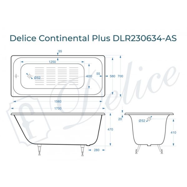 Ванна чугунная Delice Continental PLUS DLR230634-AS с антискользящим покрытием 170х70 см