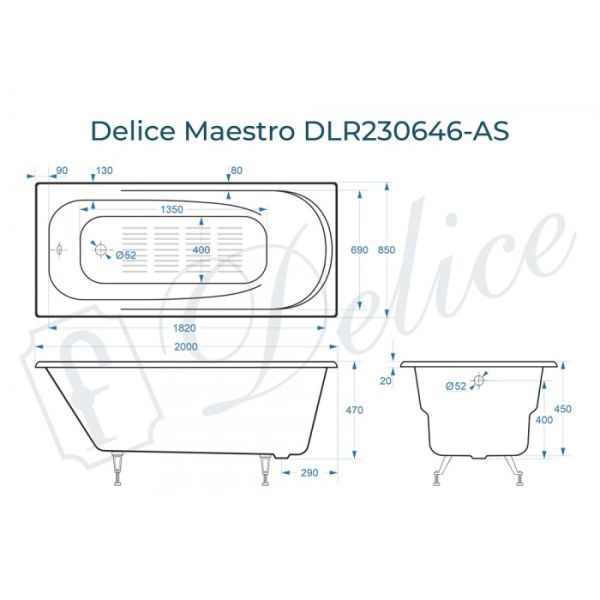 Ванна чугунная Delice Maestro DLR230646-AS 200х85 с антискользящим покрытием купить