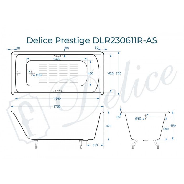 Ванна чугунная Delice Prestige DLR230611R-AS 175x75 с отверстиями под ручки и антискользящим покрытием купить