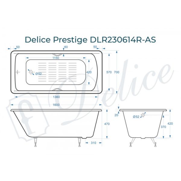 Ванна чугунная Delice Prestige DLR230614R-AS 160х70 с отверстиями под ручки и антискользящим покрытием