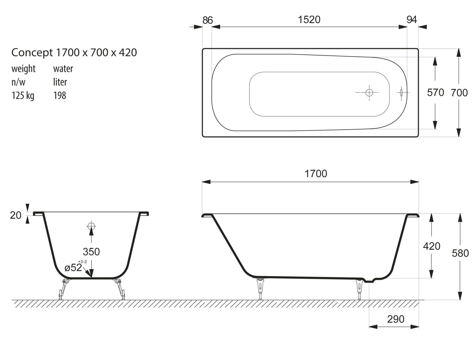 Общие характеристикиРазмер 170х75 Длина 170 см Ширина 75 см Глубина 42 см Высота на ножках 57 см Полезный объём 250 л Вес 125 кг Бренд Vinsent Veron 7 слёв титановой эмали класса 1А Цвет эмали белый Без антискользящего покрытия Диаметр слива Ø52 Расположение перелива стандартное