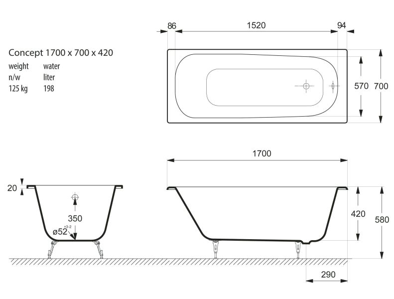 Общие характеристикиРазмер 170х70Длина 170 смШирина 70 смГлубина 42 смВысота на ножках 57 смПолезный объём 250 лВес 125 кгБренд Vinsent Veron7 слёв титановой эмали класса 1АЦвет эмали белыйБез антискользящего покрытияДиаметр слива Ø52Расположение перелива стандартное