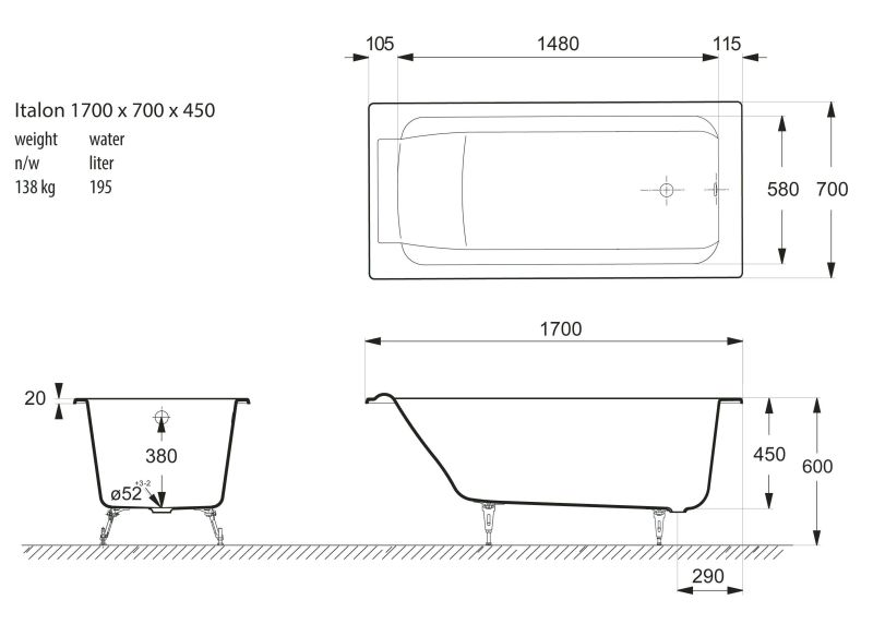 Общие характеристикиРазмер 170х70 Длина 170 см Ширина 70 см Глубина 45 см Высота на ножках 60 см Полезный объём 270 л Вес 138 кг Бренд Vinsent Veron 7 слёв титановой эмали класса 1А Цвет эмали белый Без антискользящего покрытияДиаметр слива Ø52 Расположение перелива стандартное