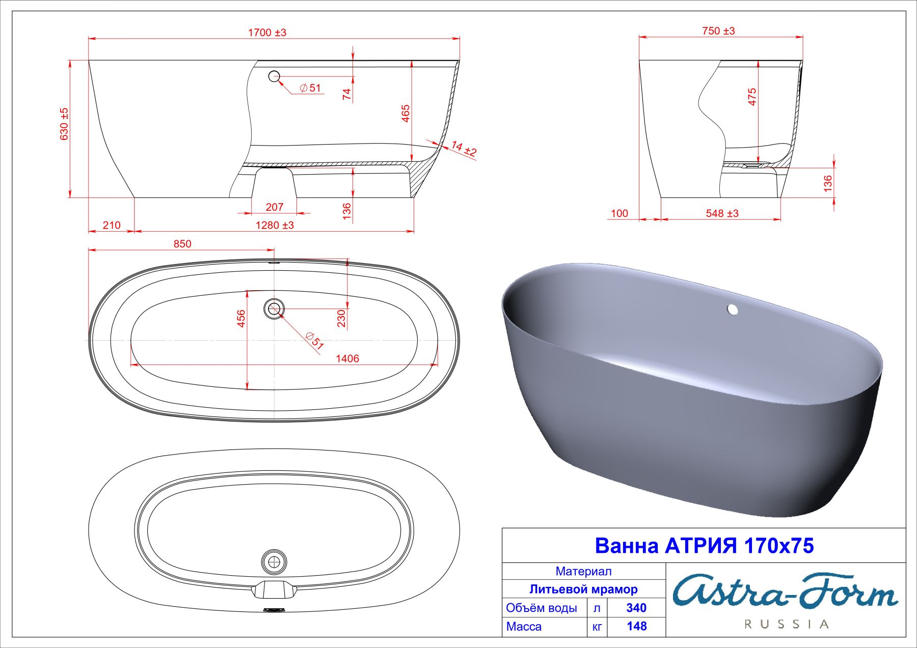 Ванна из искусственного камня Astra-Form Атрия 01010011 170x75 см белый глянец