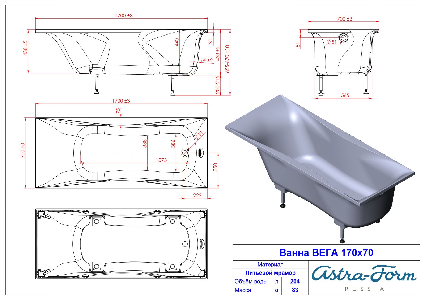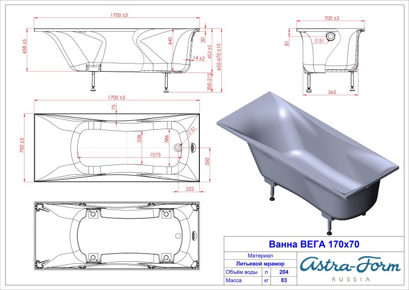 Ванна из искусственного камня Astra-Form Вега 01010067 170x70 см белый матовый