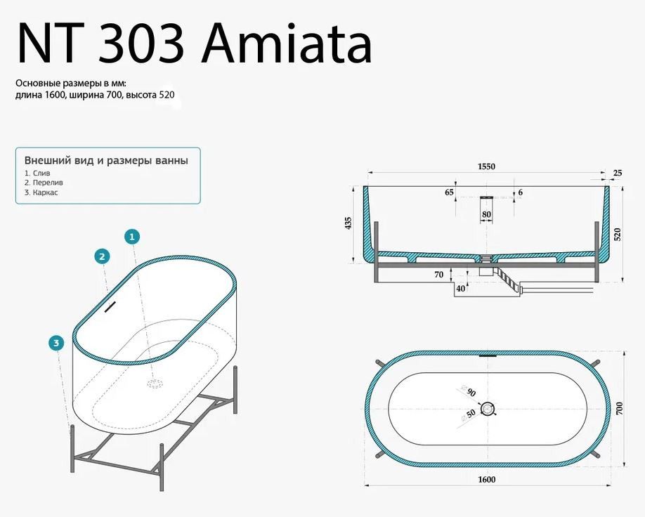 Ванна из искусственного камня NT Bagno Amiata NT303 160x70см белый матовый