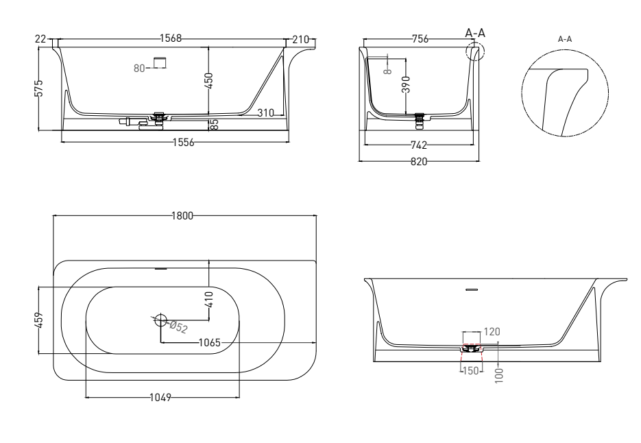 Ванна из искусственного камня Salini Ninfea S-Stone 102721MRF 180x82см RAL полностью