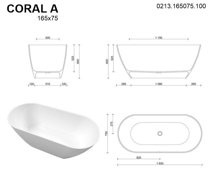 Ванна из искусственного камня Whitecross Coral A 0213.165075.100 165x75см белый глянец