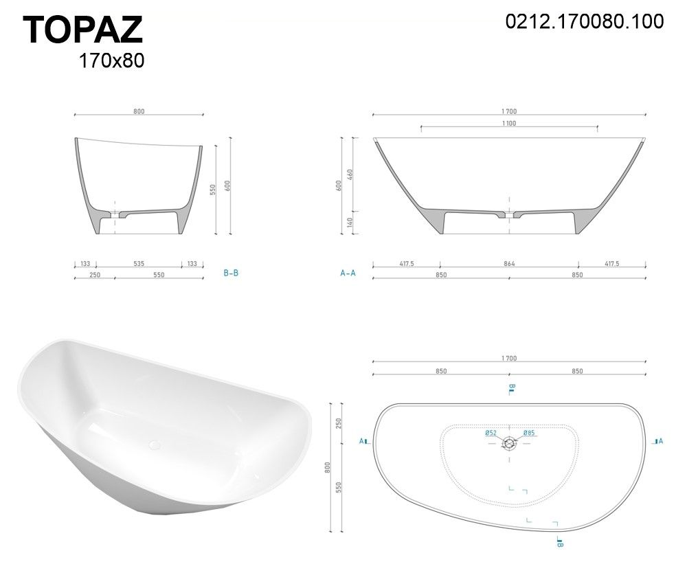 Ванна из искусственного камня Whitecross Topaz 0212.170080.100 170x80см белый глянец купить