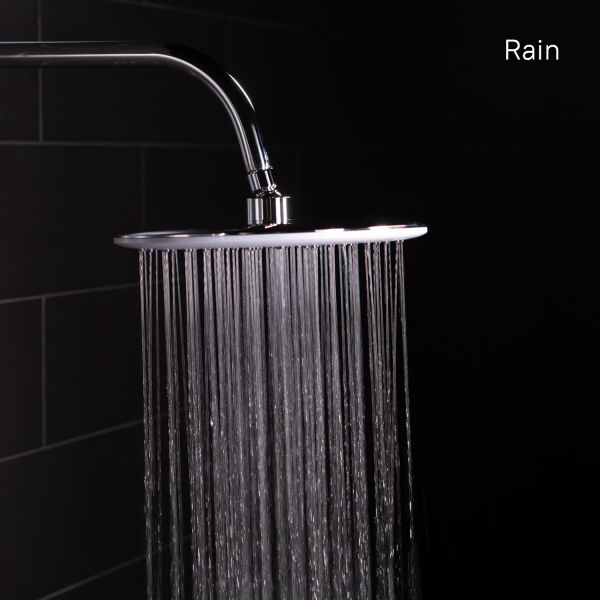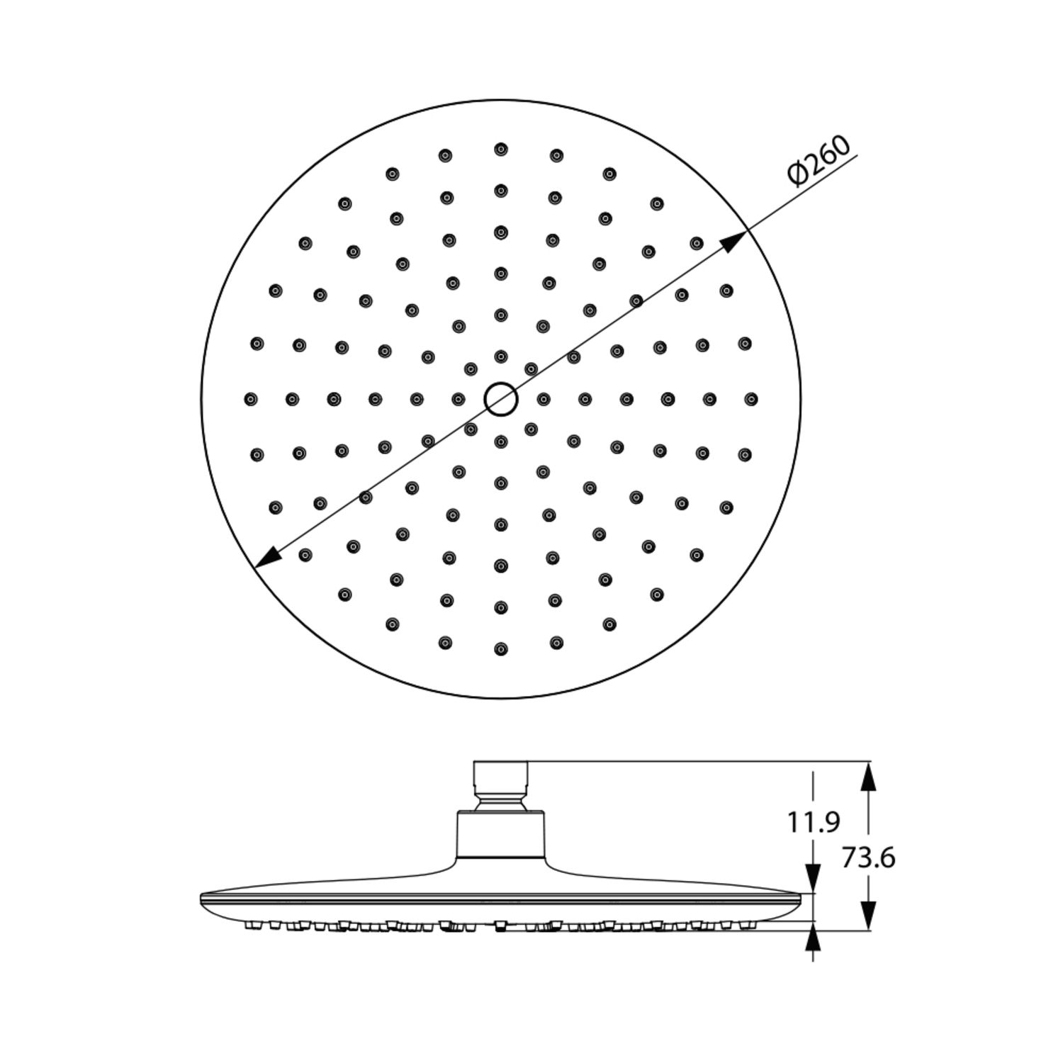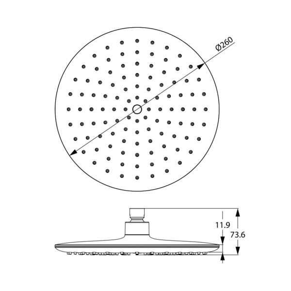 Душевая насадка верхняя, круглая, материал ABS - пластик, диаметр 260 мм, белая лицевая пластина, темно-серые форсунки, верхняя пластина ABS-пластик.