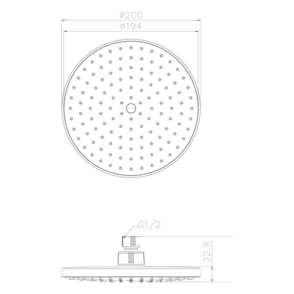 Верхняя душевая насадка Лицевая панель - серый пластик.Система Air-In.Латунный шарнирный крепеж.Диаметр - 200 мм.