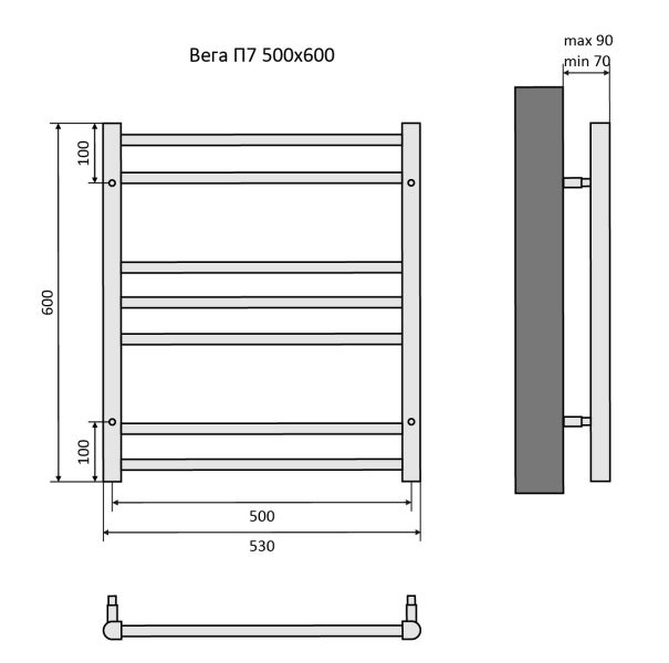 Полотенцесушитель водяной Aquatek (Акватек) Вега П7 500х600 мм, черный муар, подключение нижнее/диагональное, сверхпрочная пищевая нержавеющая сталь AISI 304L, гарантия 10 летХарактеристики:Стойка D-обр.,ребра Ф 18,без фитинговКомплектация:полотенцесушитель;