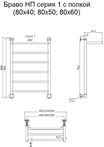Водяной полотенцесушитель Тругор Браво НП 1 П с полкой 80x40см хром Браво1/нп8040П