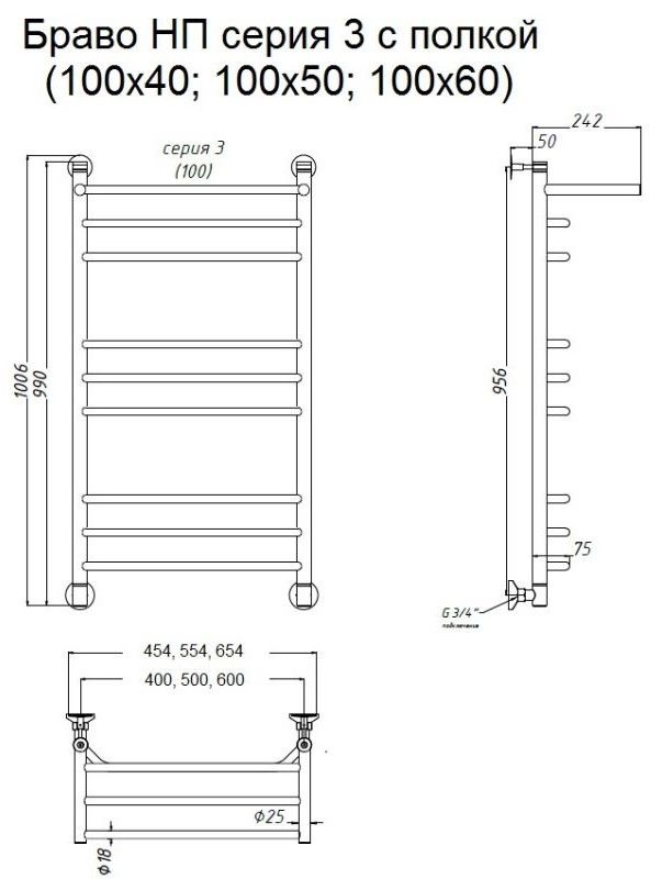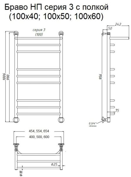 Водяной полотенцесушитель Тругор Браво НП 3 П с полкой 100x50см хром Браво3/нп10050П купить