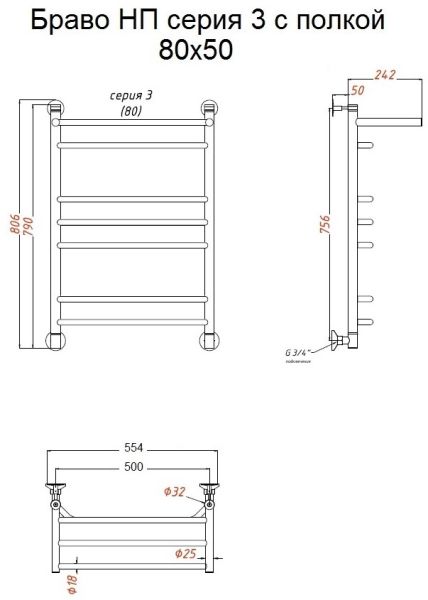 Водяной полотенцесушитель Тругор Браво НП 3 П с полкой 80x50см хром Браво3/нп8050П