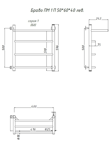 Водяной полотенцесушитель Тругор Браво ПМ 1 П 50x60x40см с полкой левый хром Браво1/ПМ506040Плев