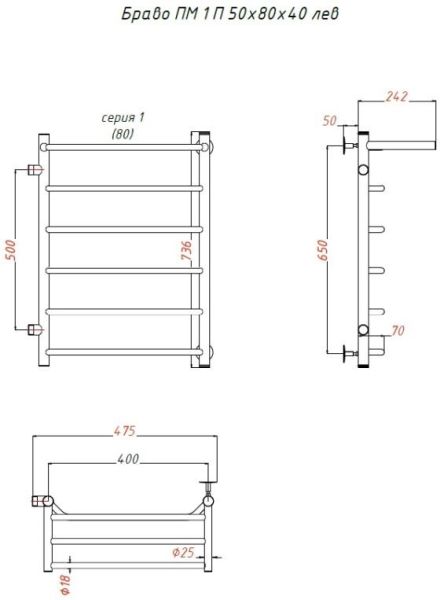 Водяной полотенцесушитель Тругор Браво ПМ 1 П 50x80x40см с полкой левый хром Браво1/ПМ508040Плев