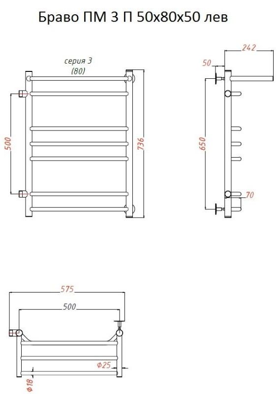 Водяной полотенцесушитель Тругор Браво ПМ 3 П 50x80x50см с полкой левый хром Браво3/ПМ508050Плев