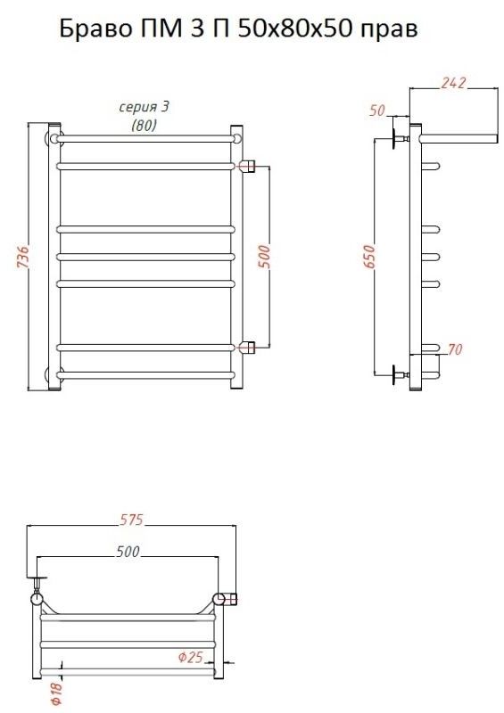 Водяной полотенцесушитель Тругор Браво ПМ 3 П 50x80x50см с полкой правый хром Браво3/ПМ508050Пправ