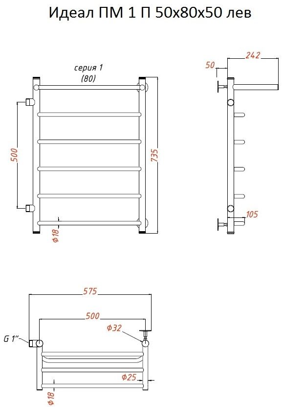 Водяной полотенцесушитель Тругор Идеал ПМ 1 П 50x80x50см с полкой левый хром Идеал1/ПМ508050Плев