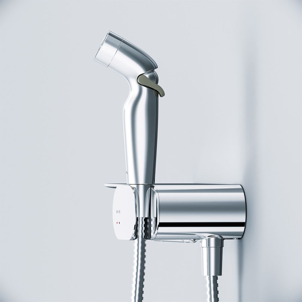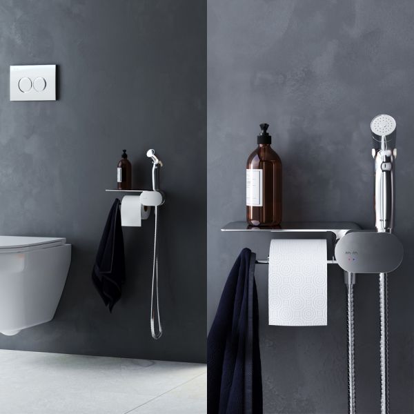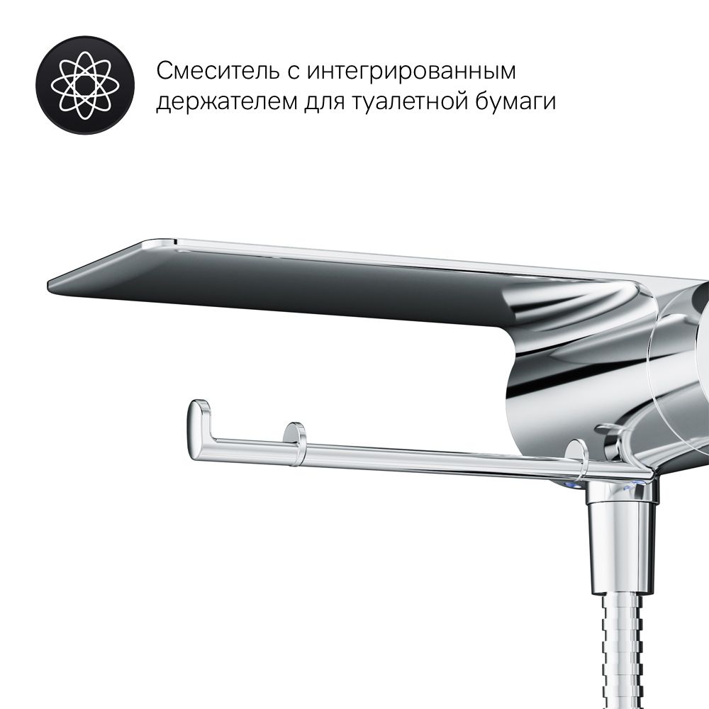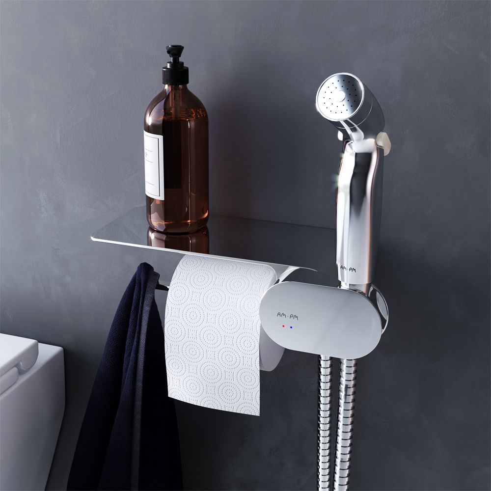 Самый широкий спектр возможностей с инновационным многофункциональным смесителем с гигиеническим душем от АМ.РМ! Смеситель оснащен прогрессивным картриджем, движение которого происходит в одной плоскости, делая управление максимально комфортным.Гигиенический душ зафиксирован непосредственно в самом смесителе, что экономит пространство и выглядит лаконично. Чтобы включить смеситель, достаньте гигиеническую лейку и поворотом ее держателя включите устройство. При нажатии на специальную кнопку на самой лейке начинается подача воды.Весь продукт представляет собой удобную полочку, на которой можно разместить все, что необходимо вам под рукой. На интегрированном держателе можно размещать туалетную бумагу, а на крючке - полотенце.Встроенный ограничитель температуры позволит избежать ожога.Совмещение рукоятки и держателя для гигиенического душа минимизирует риск забыть перекрыть воду в смесителе.
