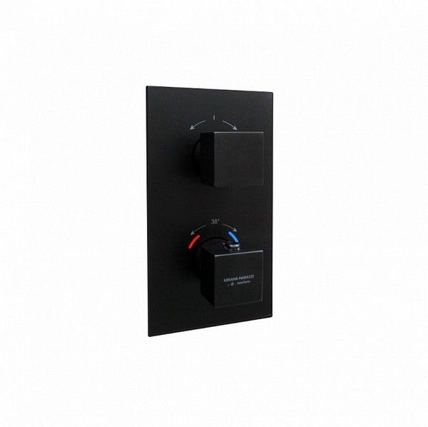 Встраиваемый термостатический смеситель для душа с регулировкой температуры, запорным клапаном и регулировкой напора воды. Соединение 3/4" (вход и выход) с переходником на 1/2". Внимание: для чистки черных и цветных изделий можно применять только мягкую губку и мыльный раствор. Использование моющих и абразивных средств запрещено.