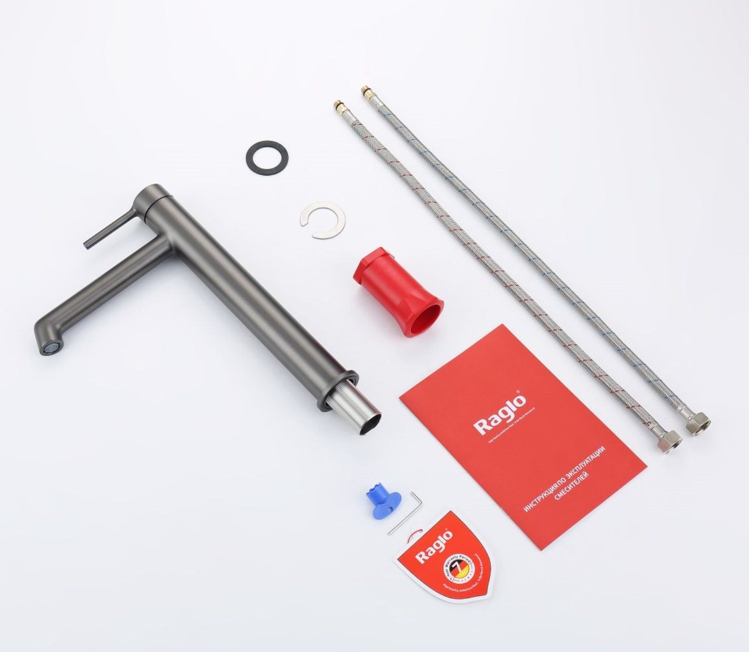 Смеситель для раковины RAGLО имеет повышенную прочность корпуса. Соответствует требованиям международного стандарта. Одна рукоять для регулировки воды. Аэратор гарантирует одинаковый поток воды, сеточка рассеивает напор, вода смягчается. Смеситель устанавливается на гайке, нижняя часть смесителя вставляется в отверстие для монтажа и затягивается гайкой для фиксации. Данный смеситель для умывальника имеет надежный стационарный излив, не меняющий своего положении. Смеситель прекрасно смешивает потоки воды, а помимо этого обладает невысоким показателем шумов. Быстрый монтаж. Крепление на усиленной гайке. Подводка длиной 55 см имеет латунные гайки. Гарантия на смеситель 7 лет и 2 года на покрытие.