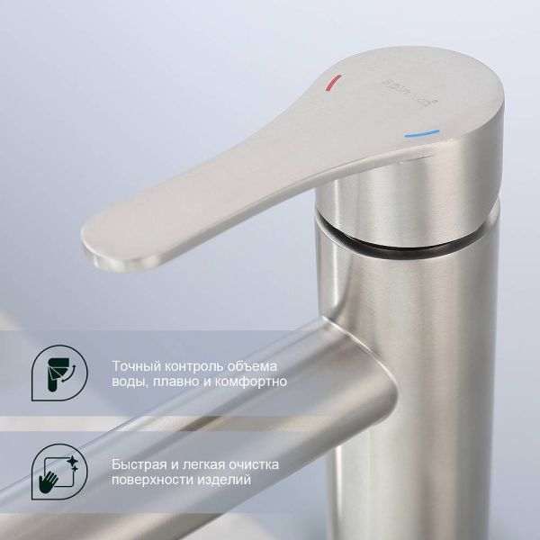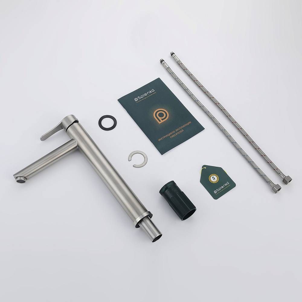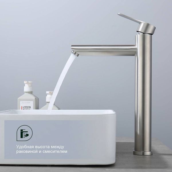 Смеситель для раковины Splenka S223.15.05, сатин. Смеситель высокий для раковины нержавеющая сталь, округлой формы. Смеситель с креплением на гайке. Все для монтажа и эксплуатации есть в комплекте.