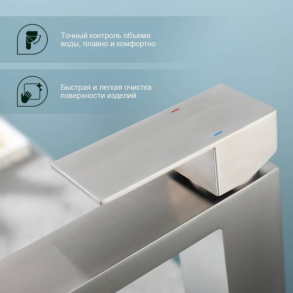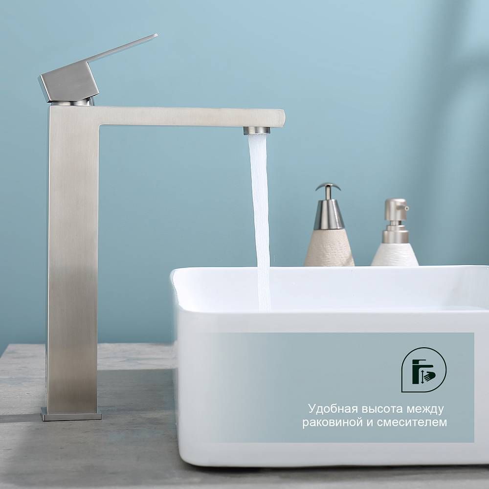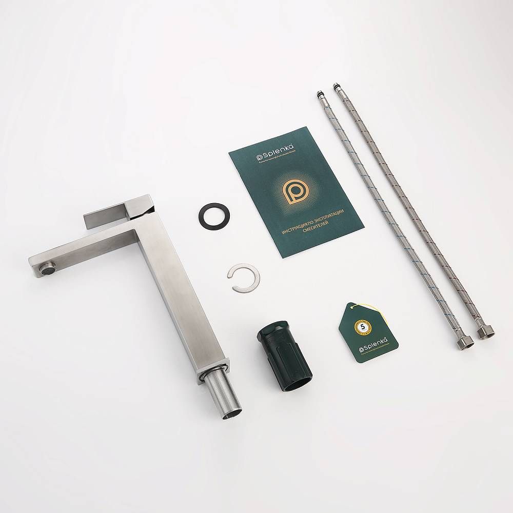 Смеситель для раковины Splenka S224.15.05, сатин. Смеситель высокий для раковины нержавеющая сталь, квадратной формы. Смеситель с креплением на гайке. Все для монтажа и эксплуатации есть в комплекте. Гарантия 5 лет.