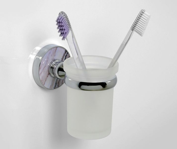WasserKRAFT Стакан для щеток с держателем K-8528Размер: Ш70 х Г111 х В100 ммМонтаж: настенныйЦвет держателя: хром, акриловая вставка "горный мрамор"Стакан: матовое стеклоМатериалы: металл, акрил, хромоникелевое покрытие, уплотнительные пластиковые кольца, матовое стекло
