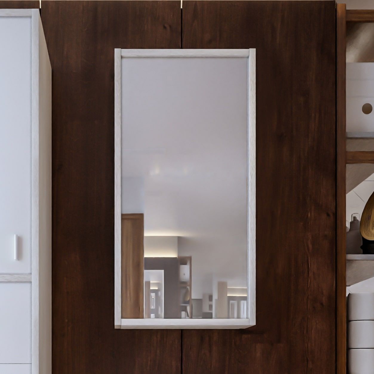 Внутреннее содержание шкафа умело организовано: разнообразные полки и отсеки позволяют удобно разместить все необходимые аксессуары – от косметики до бытовой химии. Зеркало, интегрированное в фасад, визуально расширяет пространство и облегчает утренние рутинные процедуры.