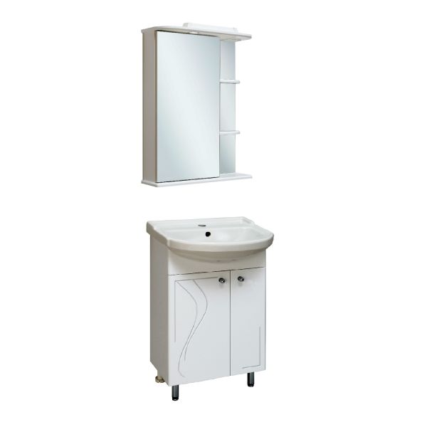 Зеркальный шкаф оборудован одним врезным светодиодным светильником 220В и розеткой с выключателем. Слева - шкаф с зеркальной дверцей и двумя внутренними полками, справа - две открытые полочки. Петли со встроенным доводчиком. Выпускается только в левом исполнении.
